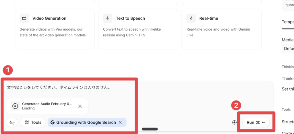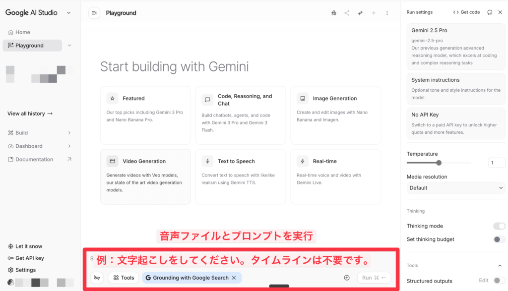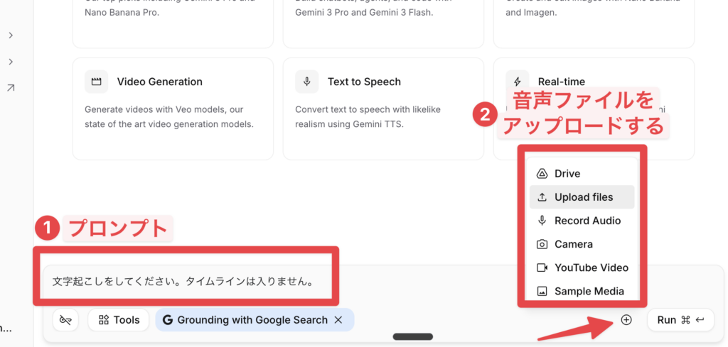 まず、Google AI Studioにアクセスしてログインします。次に、音声ファイルをアップロードし、文字起こしを指示します。