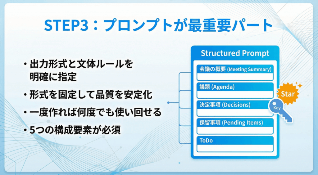 そこで重要になるのが、「出力の形式と条件を明確に指定したプロンプト」です。プロンプトで出力形式を固定しておくことで、毎回同じ構成の議事録が生成されるようになります。一度プロンプトを作っておけば、あとはコピペするだけで何度でも使い回せます。
