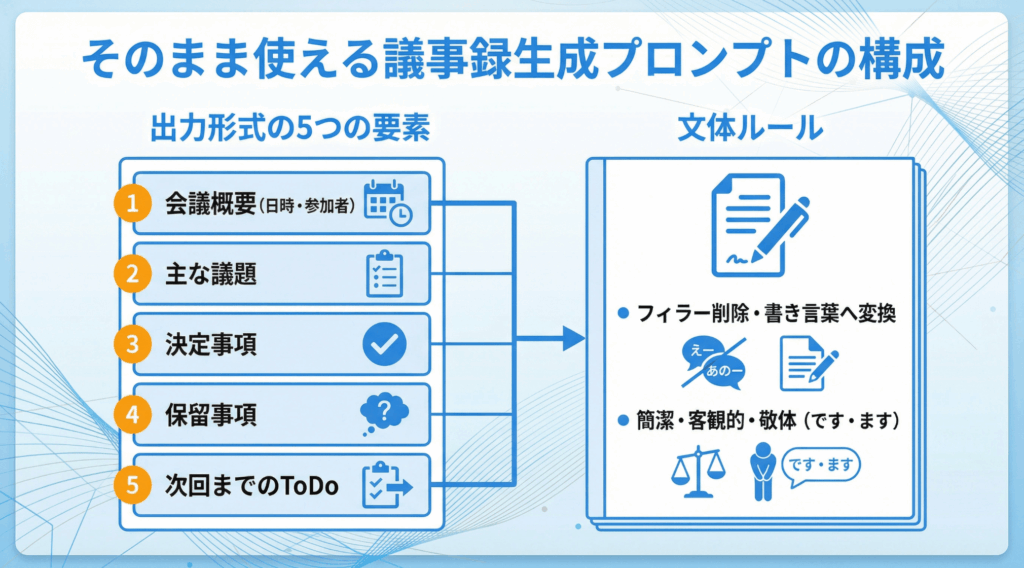 (ここに文字起こし全文を貼り付けてください)このプロンプトの特徴は、「出力形式」と「文体ルール」を明確に分けて指定している点です。形式を指定することで構成が統一され、文体ルールを指定することで読みやすさが担保されます。