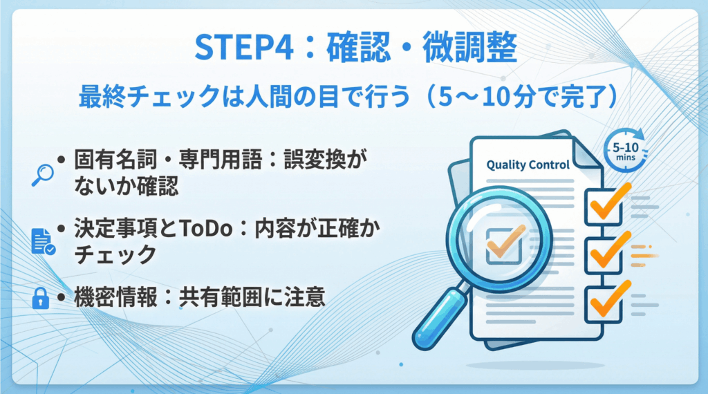 AIが出力した議事録は、そのまま使えるレベルになっていることがほとんどです。しかし、最終チェックは人間の目で行うことをおすすめします。