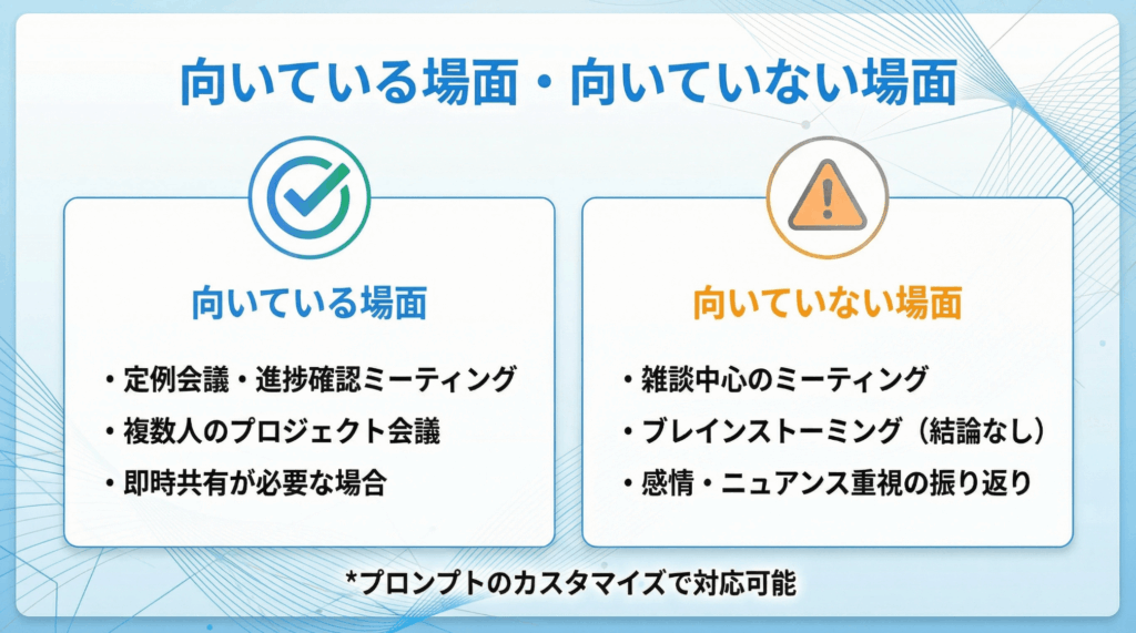 雑談中心のミーティングや、ブレインストーミングのように結論を出すことを目的としていない会議には、あまり向いていません。「決定事項」や「ToDo」が存在しない会議では、プロンプトの構成と合わなくなるためです。