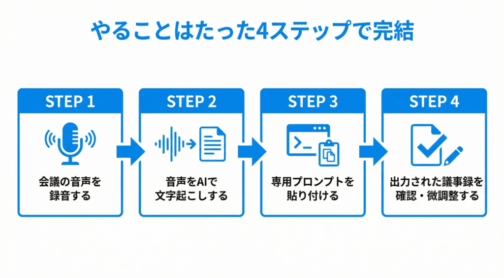 まずは全体像を把握しておきましょう。今回紹介する方法は、以下の4ステップで完結します。