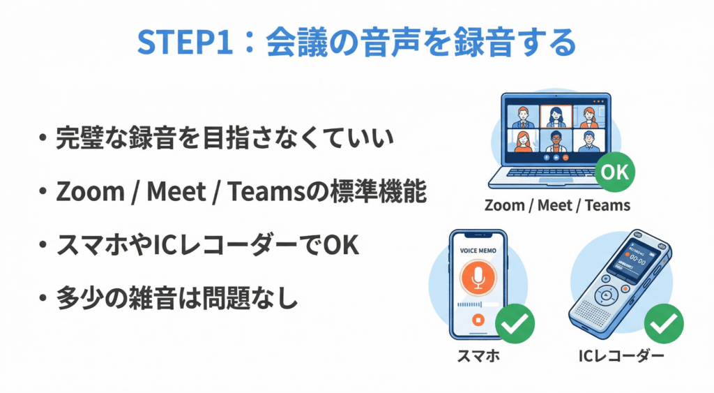 録音方法は、使い慣れたもので構いません。ZoomやGoogle Meet、Microsoft Teamsなどのオンライン会議ツールには標準で録音機能がついていますし、対面会議であればスマートフォンのボイスメモアプリやICレコーダーを使えばOKです。