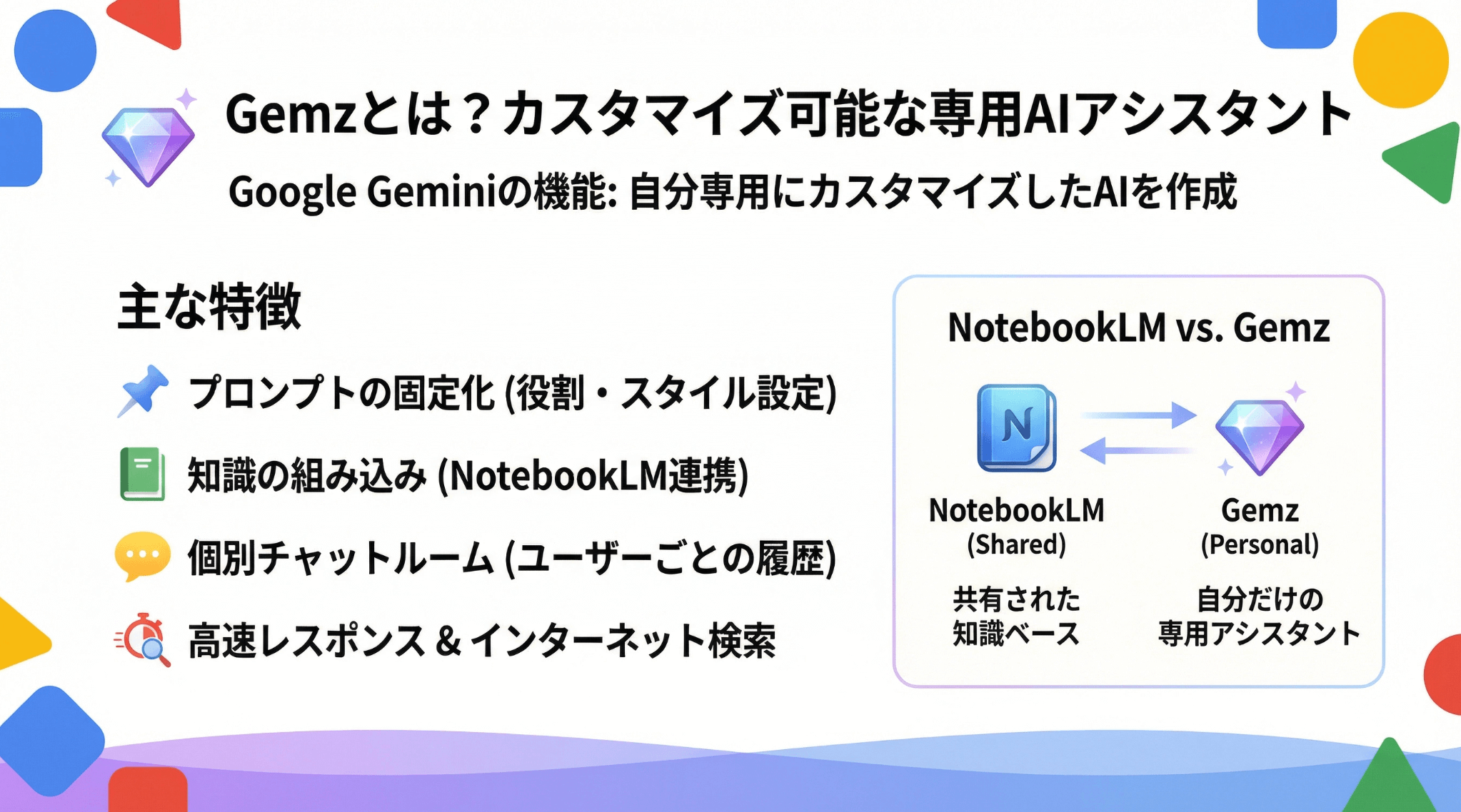 NotebookLM単体だと、1つのノートを複数人で共有する形になります。一方、Gemsを使えば、それぞれのユーザーが自分専用のチャットルームを持てるのです。