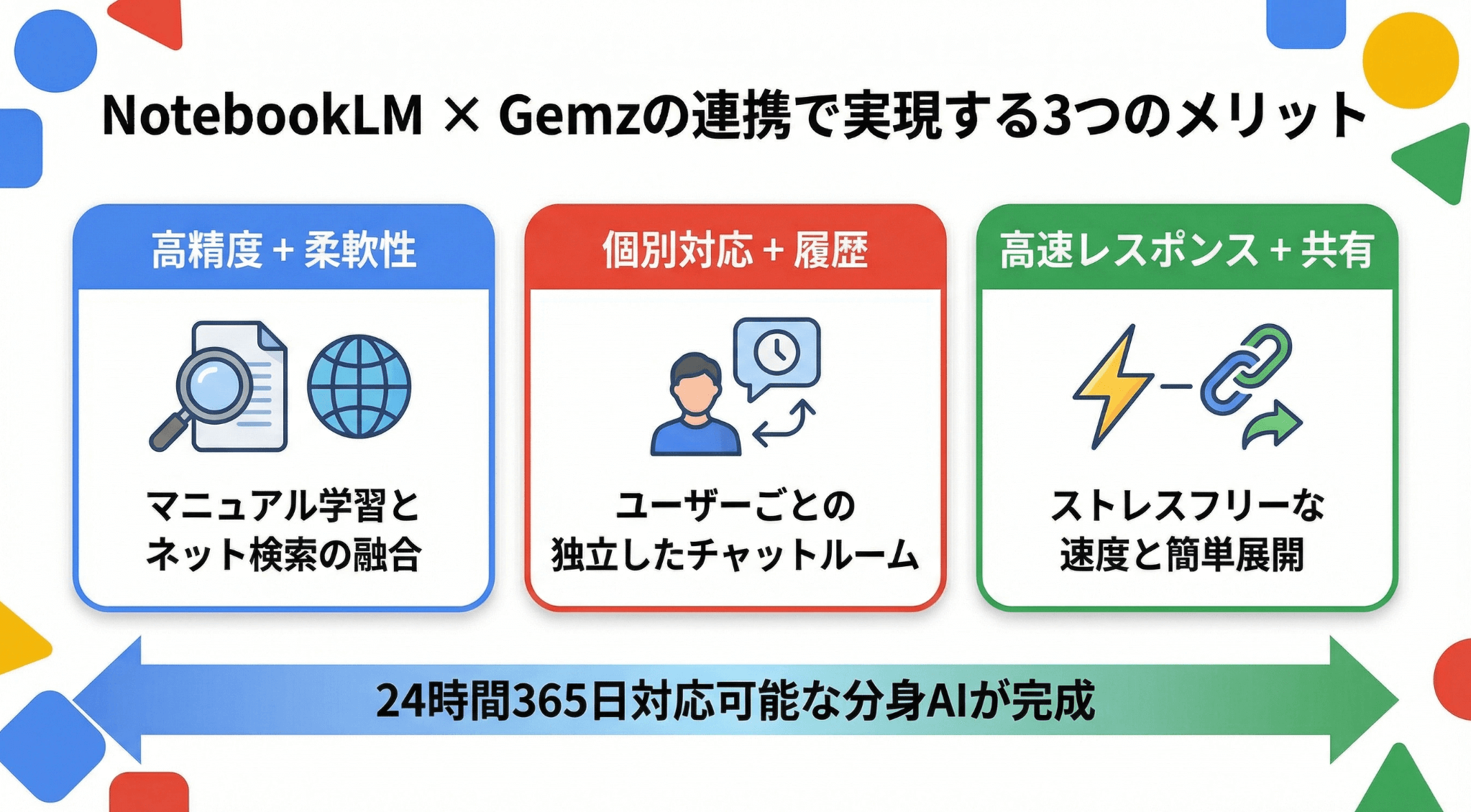 繰り返しの質問対応は、これまで「誰かが時間を使って答えるしかない」作業でした。しかし、NotebookLMとGemsを活用すれば、その時間を大幅に削減できます。