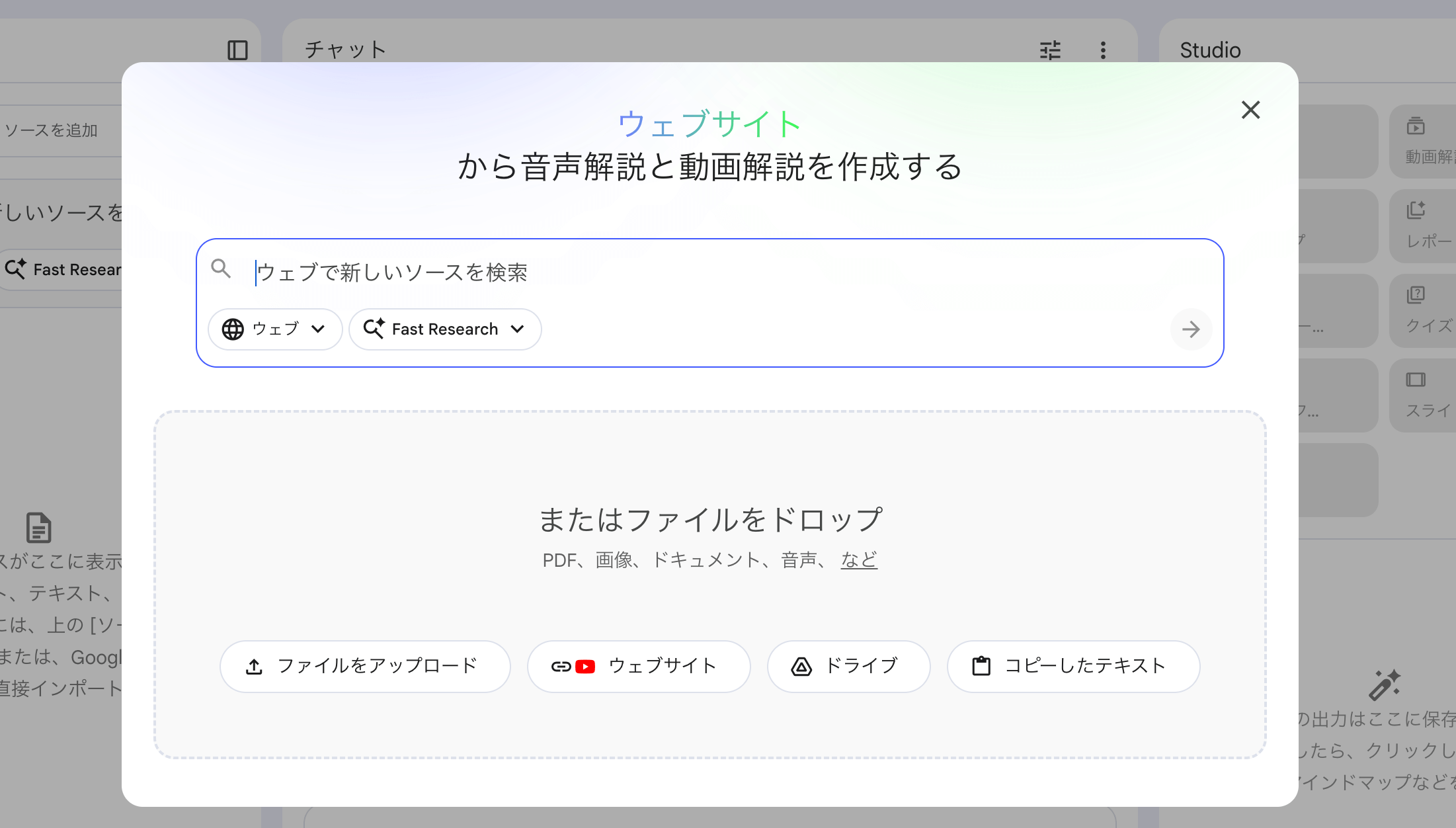 またここであらかじめ学習させておきたいものがあれば、動画や音声、ネットからのディープリサーチにて情報を読み込ませておきましょう。