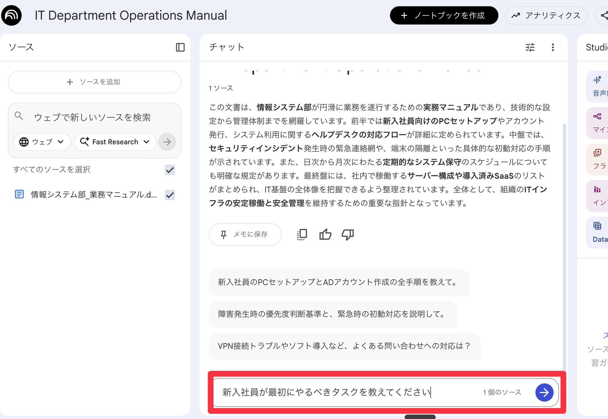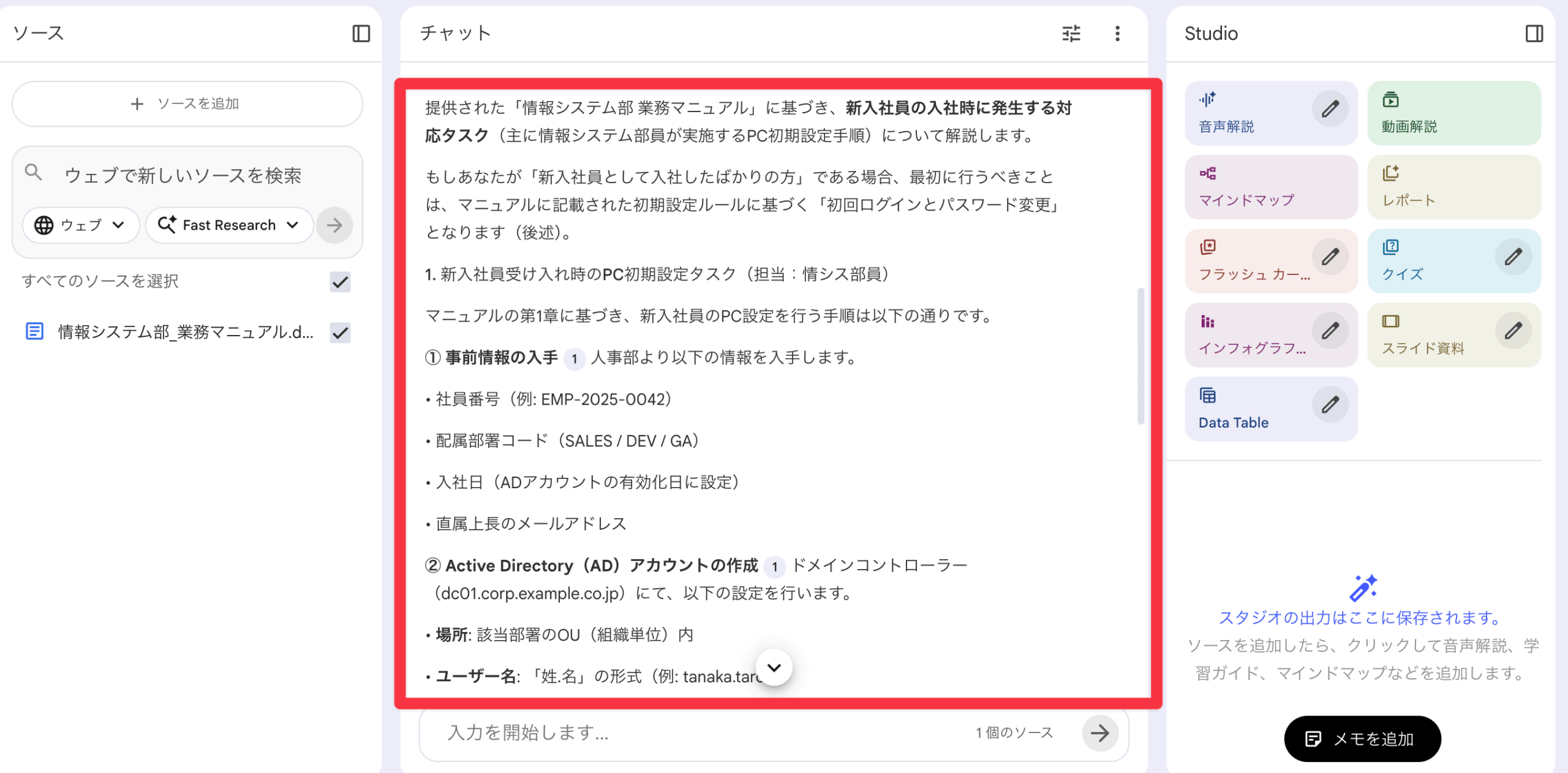 今回読み込ませたのは、あらかじめ用意した「情報システム部営業マニュアル(サンプル)」の資料です。