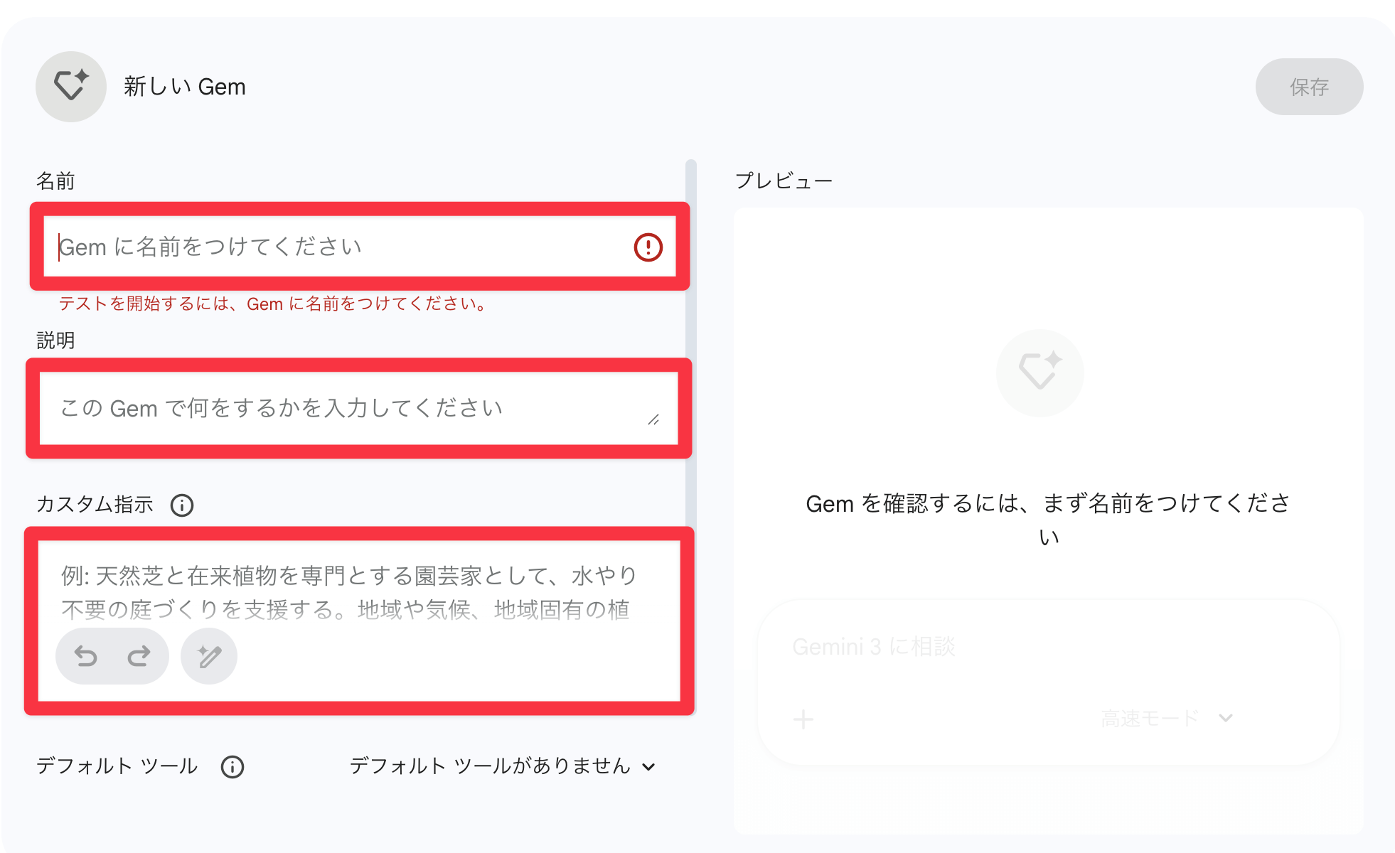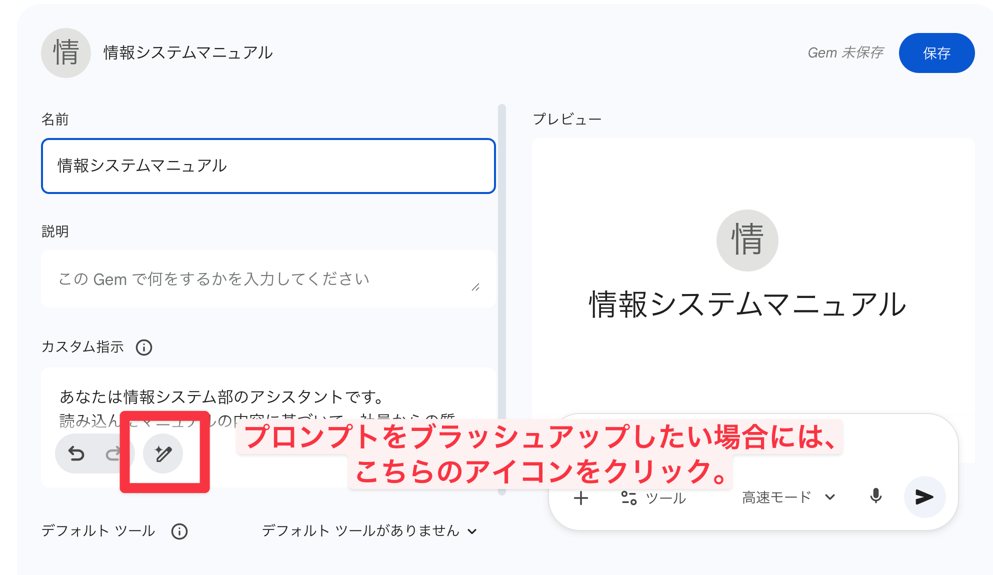 カスタム指示には、このGemにどのように動いてほしいかを書きます。