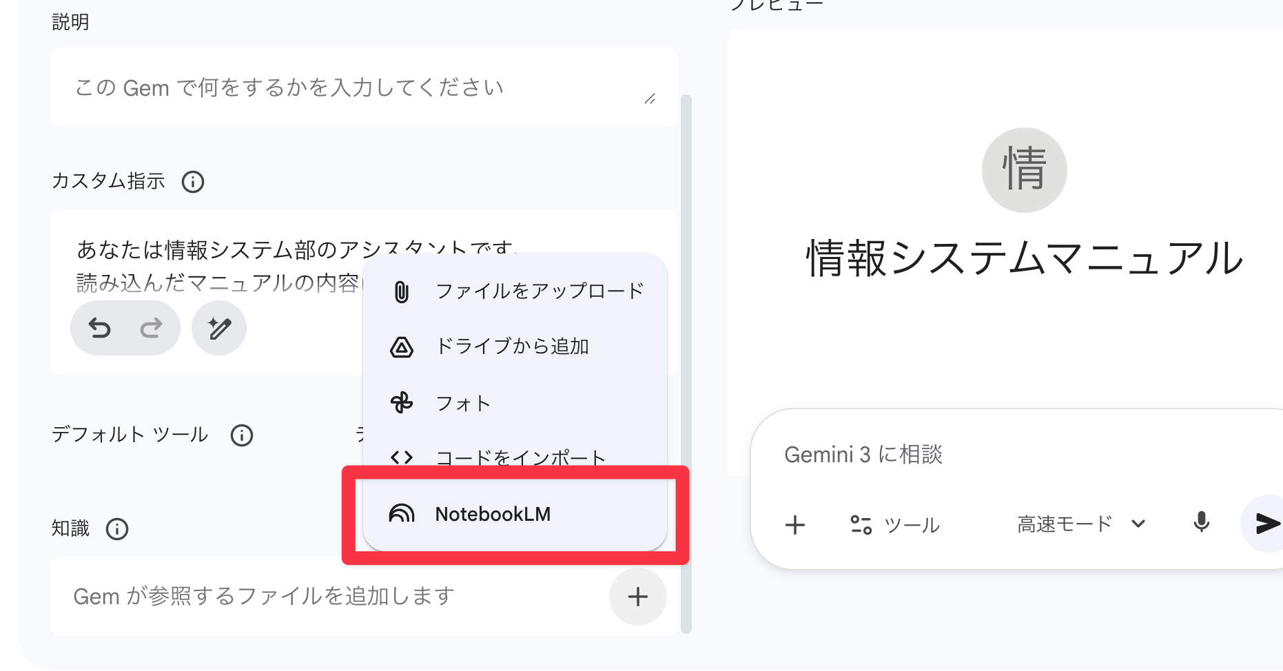 ここが今回のポイントです。作成したGemsに、STEP1で作ったNotebookLMを連携させます。