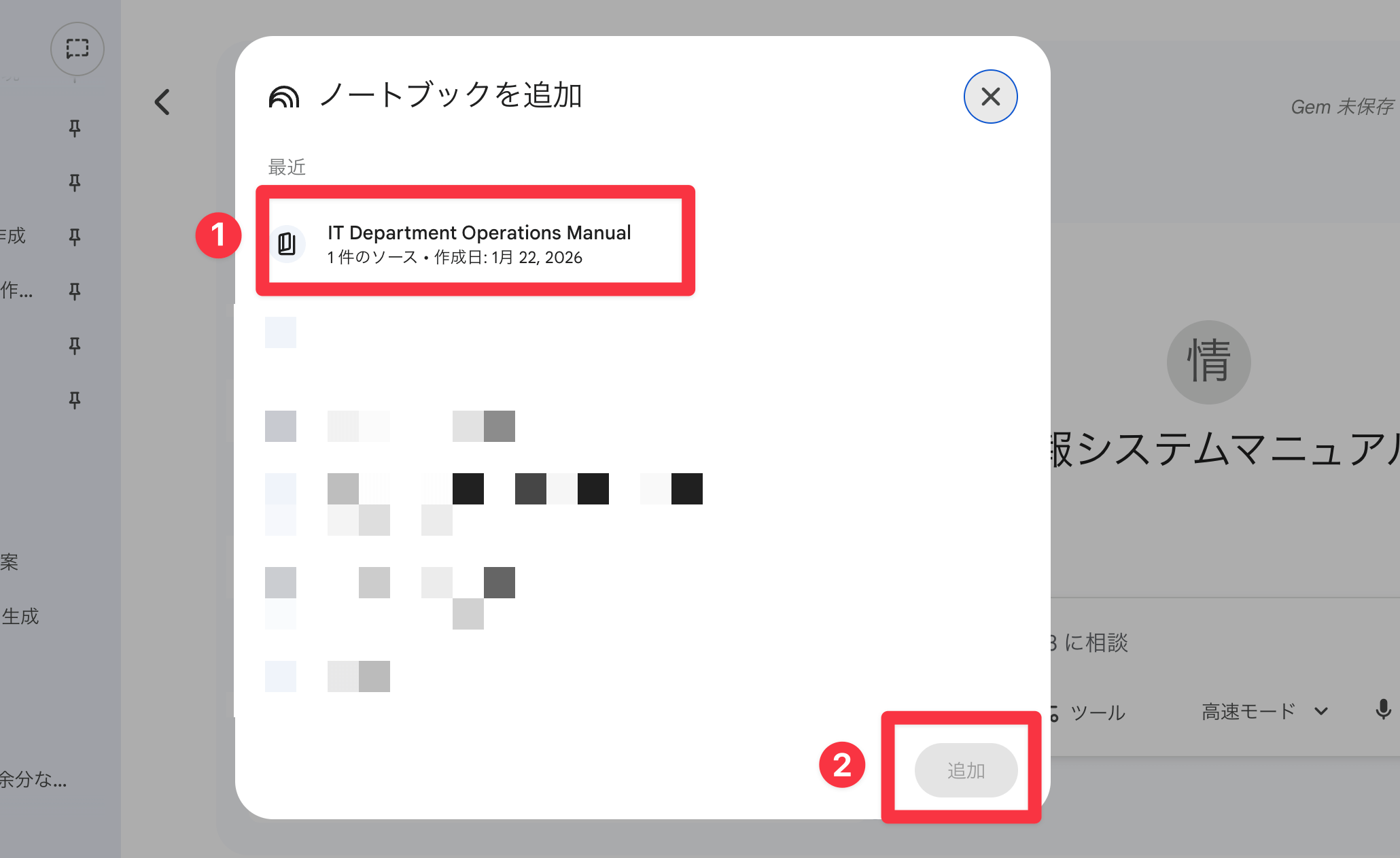 「知識」をクリックすると、自分が作成したNotebookLMの一覧が表示されます。STEP1で作成したノートブックを選択して追加しましょう。