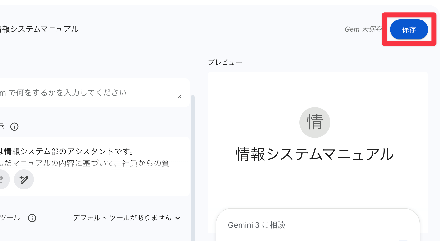 - 名前:Gemの名前(例:「システムマニュアルBot」)