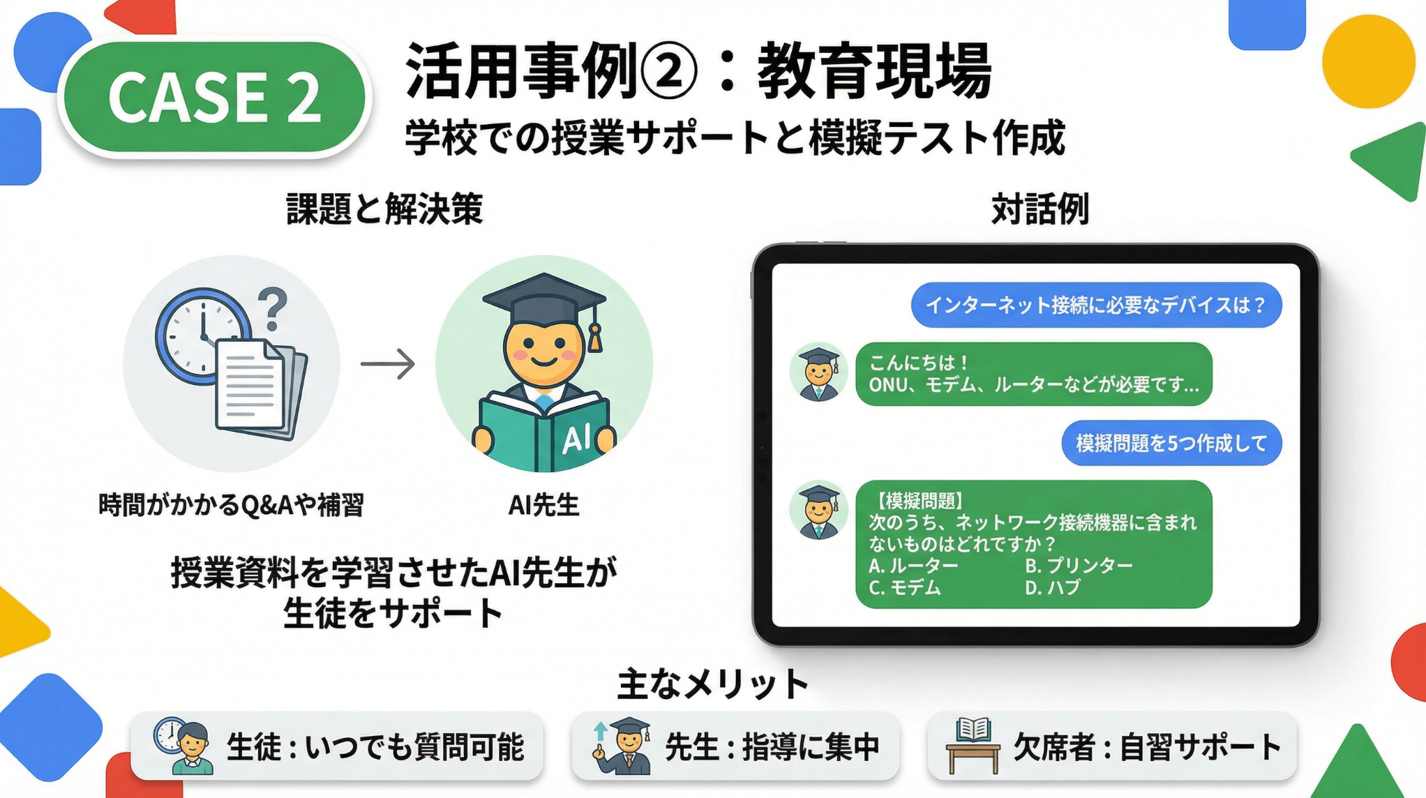 また、社内FAQ、新入社員オンボーディング、生徒への学習サポートなど、「同じ情報を何度も伝える必要がある」場面に最適です。