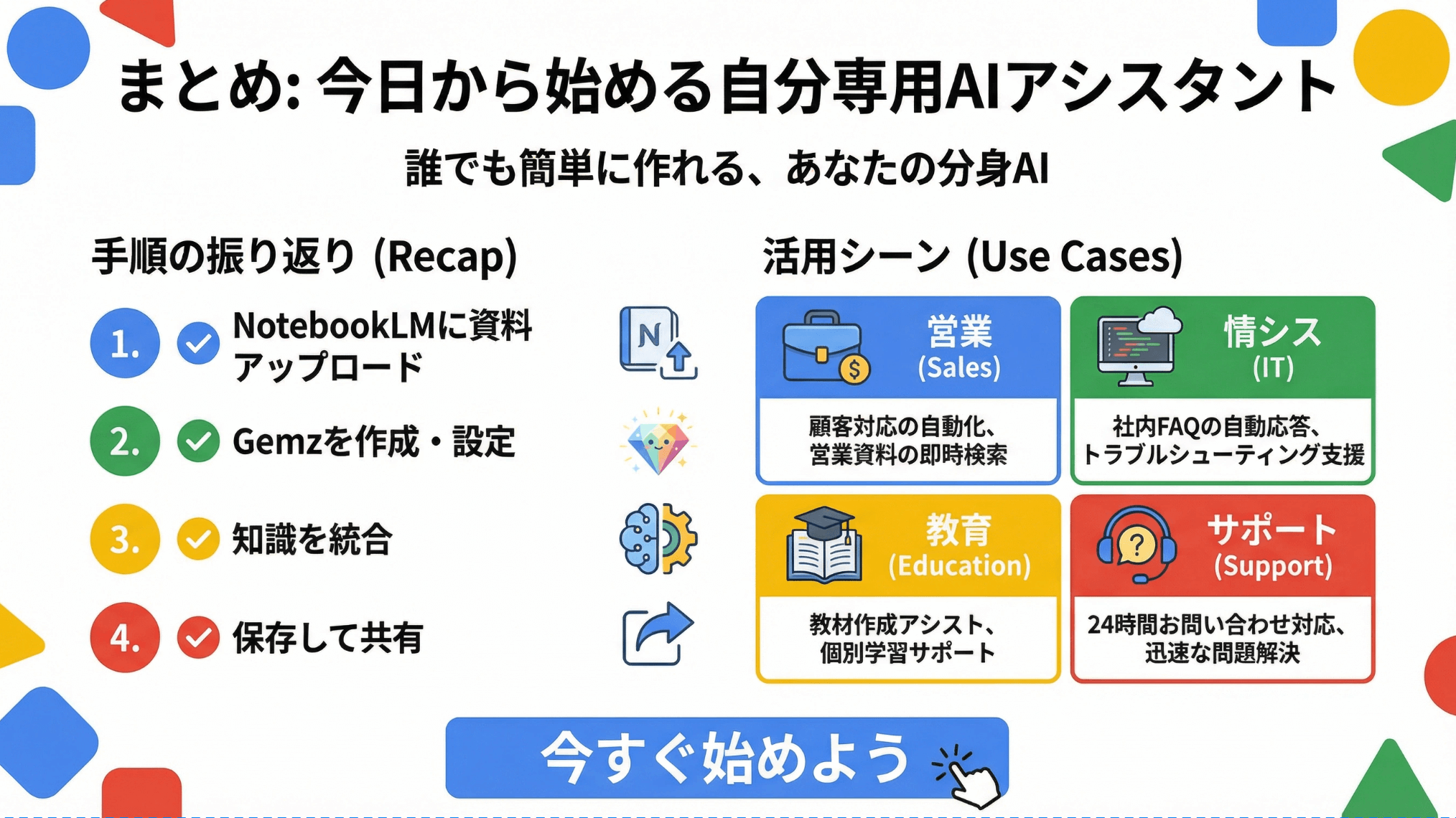 まずは自分が持っているマニュアルや資料で、今回紹介した方法を試してみてください。一度体験すれば、「こんなに簡単に自分専用AIが作れるのか」と驚くはずです。